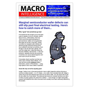 Fortunately, however, today’s ultra high-speed automated semiconductor macro defect wafer inspection systems can automatically provide a wealth of additional defect data – to inform and improve every subsequent processing step and inspection. We’ll talk more about that in a forthcoming issue of Macro Intelligence.
